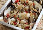 文蛤1000克、青红辣椒各15克。姜适量、蒜瓣适量、豆豉10克、砂糖5克、酱油适量、生粉5克。