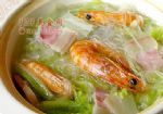 芦笋50克、鸡蛋两个、米饭一小碗、对虾三只、培根8、9片、盐。