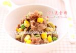 茄子250克、猪肉120克、洋葱20克、玉米粒和豌豆各少许。料酒1茶匙、李锦记财神蚝油2茶匙、盐少许、水淀粉1、5茶匙、油2茶匙。