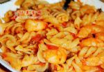 螺旋意面、鲜虾、洋葱、番茄、蘑菇。意面酱料、鲜罗勒叶、盐。