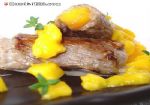 嫩牛肉、鲜芒果。厨用葡萄酒(cooking、wine、或料酒)、老抽、李锦记黑胡椒酱、芒果酱、蜂蜜、黄油(butter)。