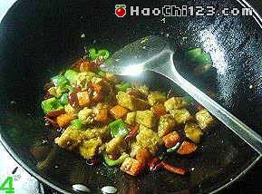 4、热油葱姜炝锅,下干红辣椒段炒香,倒入豆腐,胡萝卜丁,和青椒丁,加盐蚝油翻炒,中途可稍加点水。翻炒加鸡精出锅装盘即可。