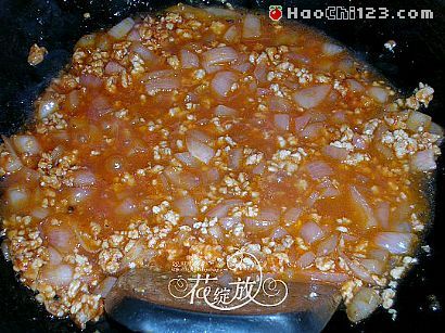 5、加入半杯水,用中火烧沸再改小火烧约两分钟至汤汁将干时,勾芡制成肉酱盛出待用。