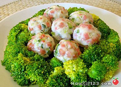 4、把蒸好的鱼丸放入摆好西兰花的盘子里。
