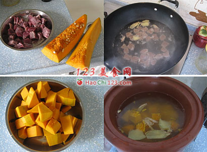 3、再把南瓜去皮,去籽,切块,放进去一起炖,半个小时候即可。