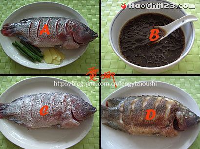 3,准备兑汁。这个是这道菜成败的关键。一般一条1。5磅的鱼我用的兑汁配方是:1杯水+2匙白糖+1匙生抽+1匙老抽+1匙料酒+1匙米醋+少许鸡精+1匙枫糖(SYRUP)没有这个就用蜂蜜代替+1匙香油+少许白胡椒粉