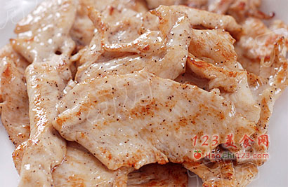 1、鸡胸肉片成薄片,均匀的撒盐,黑胡椒粉腌制一会,用淀粉抓匀。洋葱切圈。