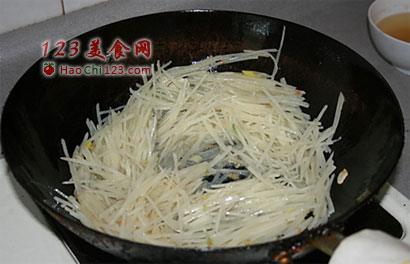 2、锅中烧油,炒香葱姜蒜,将土豆丝下锅炒。