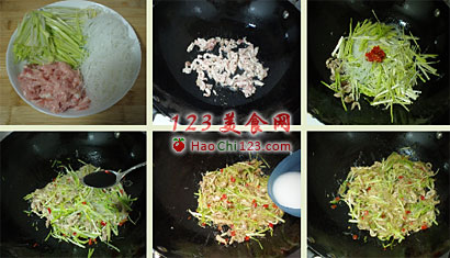 2、热锅放油,下入瘦肉丝,快速划炒至肉丝变色。
