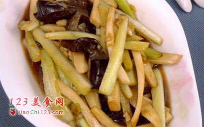 6、将碗汁中的葱姜蒜捞出后,倒入锅中炒香,并倒入木耳炒匀,然后倒入碗汁淋香油出锅。