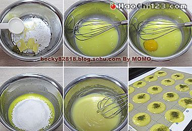 4、面糊装入裱花袋,挤在铺有不粘布的烤盘上,待面糊自然扩散成圆饼形后,撒上适量海苔粉。