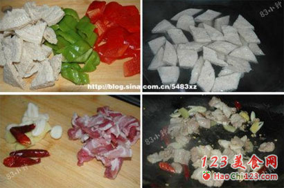 2、锅里放油,油热后下五花肉片煸炒至出油,下姜,蒜炒香。下豆瓣酱炒至出红油。倒入青红椒片,翻炒。倒入脆皮豆腐翻匀,加适量盐,少许老抽、白糖,翻匀。盖上锅盖,把整锅菜焖煮至豆腐入味后,加少许胡椒粉提味即可。