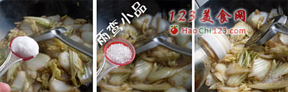 4、盐一定要等炒完菜以后最后放,如果盐放的过早的话白菜就会有很多的汤出来,也会应先口感。[LaoYanHuo.com]