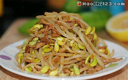 4.锅中余油再次烧热,倒入黄豆芽翻炒,加适量盐,醋调入少许白糖炒至豆芽稍软后倒入鸭丝。