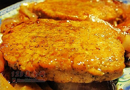 贴士:煎就不能放很多油,那样口感才会嫩,否者就是炸牛排了,不老才怪呢,后来咪用猪排改良了一下,学斗牛士的铁板牛扒加上了洋葱,就更是洋味十足了。又香又嫩,猪扒吸取了洋葱的香味,洋葱吸收了猪扒的美汁,不是咪自夸,这口感,这味道,没话说,绝不输店里的。[LaoYanHuo.com]