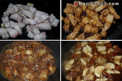 2、热锅下油,放姜片炒香,下沥过水的五花肉翻炒至出油。
