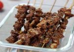 5、将裹满调味料的羊肉依次穿在串烧叉上。