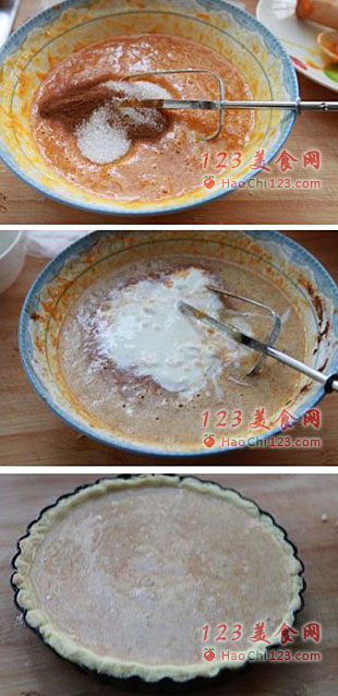 2、最后放入淡奶油搅拌均匀即成南瓜馅,将做好的南瓜馅倒入烤好的派盘中9分满。烤箱预热至220度,中层,上下火,烤8分钟。烤箱火力调至150度,继续烘烤25分钟,取出放凉,在表面筛入糖粉即可。