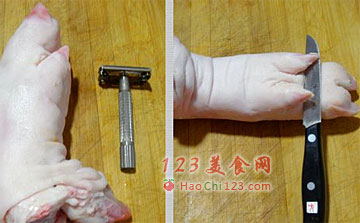 2、猪蹄好吃,但去除猪毛;砍劈分半不是轻而易举。不但要有耐心,还要有得心应手的五项工具才行。[LaoYanHuo.com]
