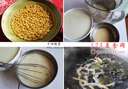 4、泡一些黄花菜,紫菜和木耳,锅里烧开水,加点盐和酱油,然后把泡好的黄花菜等扔进去,烧开,最后撒上香油就成了豆腐脑的汤。