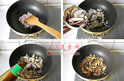 3、锅中放入少许油加热,放入肉碎炒至变色,再加入香菇炒软,调入蚝油炒匀盛出备用。