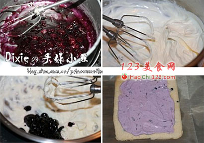 3、鲜奶油加入糖粉搅打至浓稠时加入放凉的蓝莓酱,继续搅打至不会流动的浓稠状即可。
