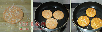 7、在案板上均匀地撒上一层熟芝麻,将小圆饼放在芝麻上轻轻地按压,使之两面都沾上芝麻。