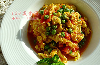 4、炒锅留底油,用一点蒜末爆香,迅速加入番茄块和白糖,再淋入少许热水,大火翻炒,最后加入处理过的豌豆和剩下的蒜末,至香至软,混和入味,最后加入适量的盐,滴上几滴香油,即可盛盘食用了。