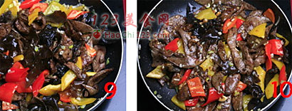 9、倒入猪肝、泡好的黑木耳,煸炒。