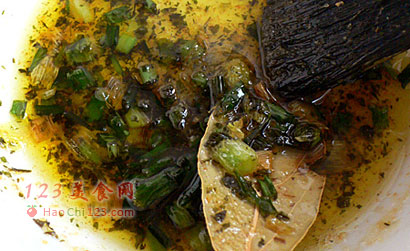 3、香葱洗净切碎,将平锅放入奶油,油热融化后放入香葱碎,待其变软出香后加入香叶和香芹碎,趁热混和成奶油香葱料,加上适量的食盐调味,随即倒入调料碗中。