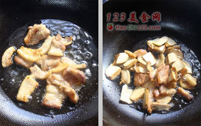 3、锅中放油,小火煎香五花肉和熏干。一定不要怕费时间,慢慢先将肉片煎黄,再将熏干煎焦。只有达到这二个标准,才算有了肉香和豆制品的香气。