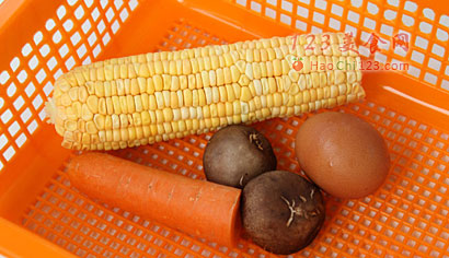 3、锅中加入高汤烧开后放入香菇丁与胡萝卜丁,中火煮15分钟,然后加入玉米粒再煮10分钟。