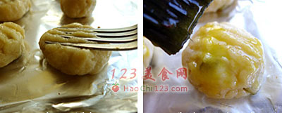 4、双手蘸点玉米油,将软面揉成一个个猫爪大小的面团,放入烤盘中,再用叉子轻轻按一下,刷上些蛋黄液,放入烤箱中。