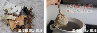 2、把浸泡十五分钟后的煲汤料沥干水分放到纱布上。提起纱布的对角系紧,制成一个汤料包。在砂锅里放入足量的水,放入纱布汤料包后开火,盖上锅盖。