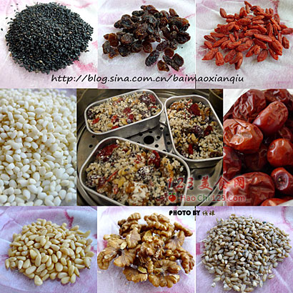 1、也可加入荞麦、糙米、薏米等谷物杂粮。红枣、黑芝麻、葡萄干、核桃、松子、糯米等干果杂粮都是冬季具有补血健脑作用的暖身食材,其实不用加糖,这糕饼就够甜了呢。