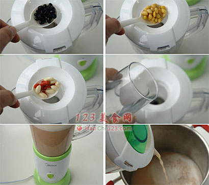 2、将泡好的黄豆,黑豆,花生倒入料理机中,加入适量的水,开动料理机40秒钟,然后倒入锅中,继续加入清水搅打,直至搅打的浆汁变清。