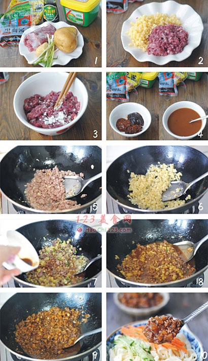 7、将牛肉末倒入锅中与土豆丁混合,倒入调好的酱汁,再加少许生抽。