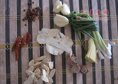 3、葱、姜、花椒、干辣椒、话梅、黄芪片、当归片、大蒜全部放入。