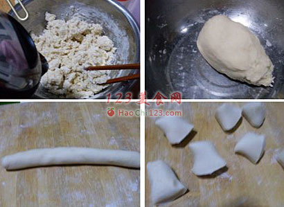 4、将饧好的烫面面团搓成长条。