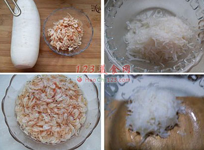 2、白萝卜去皮擦丝,加少许盐拌匀至出水再挤干。