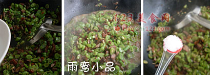 5、放红咸菜丁,然后放肉丁翻炒均匀。