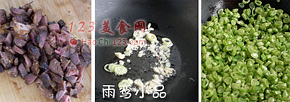 2、红咸菜洗净切丁,红烧肉也切丁。