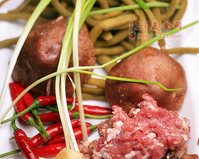 5、酸豆角发干,加入香菇继续煸炒然后加一点水盖盖改小火炒熟。