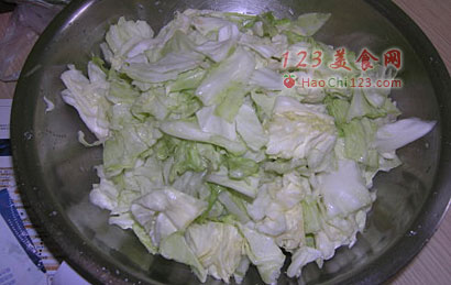 3、在甘蓝中加入少许水,然后装入保鲜袋中,反复揉捏,使甘蓝完全变软,同时味道也能完全进入。