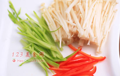 2、金针菇切段,芥蓝去皮切丝。