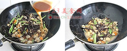 4、锅中倒入油,待油温7成热时,放入大蒜煸至双面金黄后,倒入木耳丝和芹菜段,翻炒1分钟后,倒入扇贝,翻炒几下后,淋入酱汁,搅拌均匀待汤汁变黏稠后,即可关火出锅。