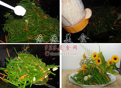 5、蒜头爆出香味后,倒入胡萝卜丝,煸炒至胡萝卜丝变软。