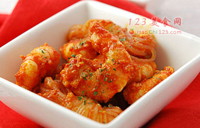 6、放入过油段生的虾仁和魔芋丝翻炒,炒制料汁包裹全身后即可盛出。