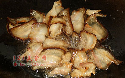 2、将仔姜切成片、泡椒切成小节。锅内放少许油,放入腊肉片爆炒出油;待肉片变成肉卷时,放入仔姜、泡椒炒香。