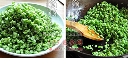 2、锅烧热注入少许油,将豇豆末倒入锅中翻炒至断生,搁精盐及少许胡椒粉调味,将其摊凉备用。